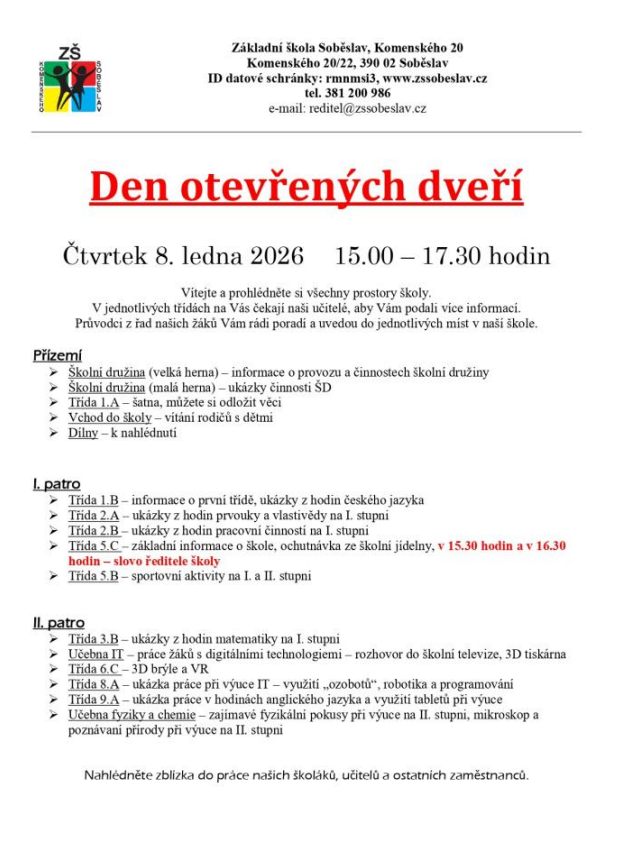 Den otevřených dvěří ZŠ Soběslav, Komenského 20